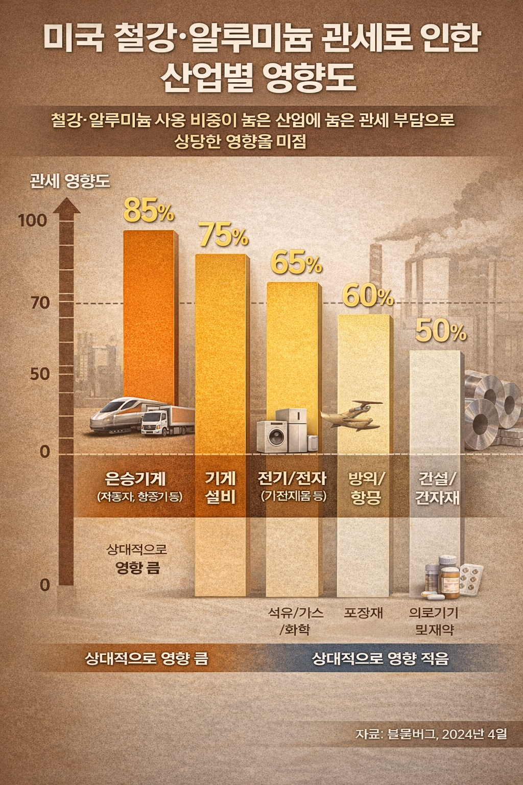 자동차 부품 산업은 철강 비중이 높은 제품이 많아 이번 관세 정책의 영향을 직접적으로 받을 가능성이 크다고 판단됩니다.