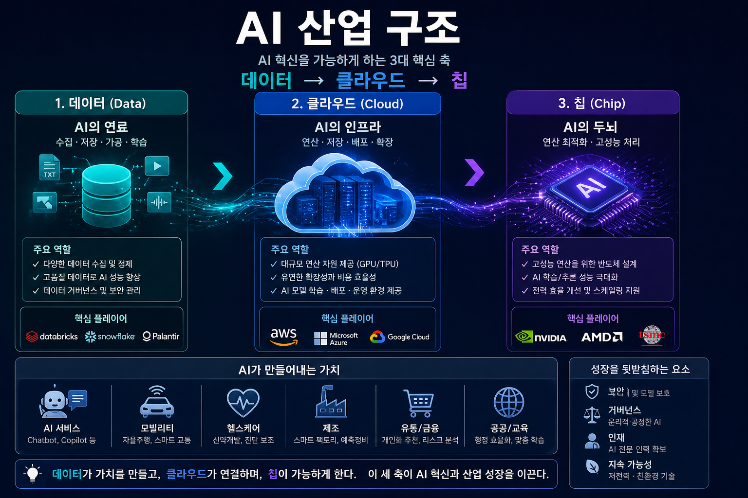 한국경제연구원 보고서에 따르면 국내 AI 산업의 연평균 성장률은 두 자릿수를 유지하고 있지만, 핵심 AI 모델 개발 역량 측면에서는 미국과의 격차가 여전히 크다는 분석이 나옵니다(출처: 한국경제연구원). 이 격차를 좁히는 데 필요한 건 단순한 기술 투자가 아니라, 데이터·인프라·반도체를 잇는 수직 계열화된 생태계 설계 능력입니다.