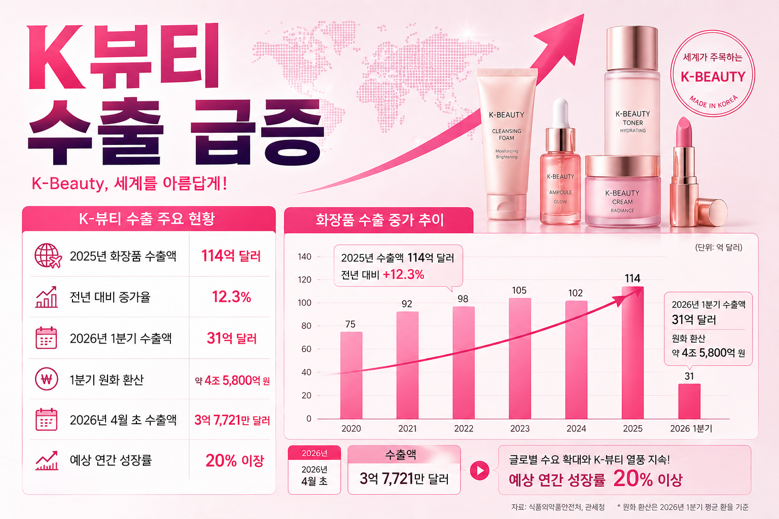 올 1분기 화장품 수출액은 31억 달러(약 4조 5,800억 원)로 분기 기준 역대 최대치를 기록했습니다(출처: 식품의약품안전처). 지난해 연간 수출도 약 114억 달러로 전년 대비 12.3% 늘었고, 올해는 20% 이상 증가할 것이라는 전망도 나오고 있습니다. 수치 자체는 분명히 좋습니다. 다만 이 수치가 모든 화장품 기업에 골고루 반영되는 건 아니라는 점을 놓치면 안 됩니다.