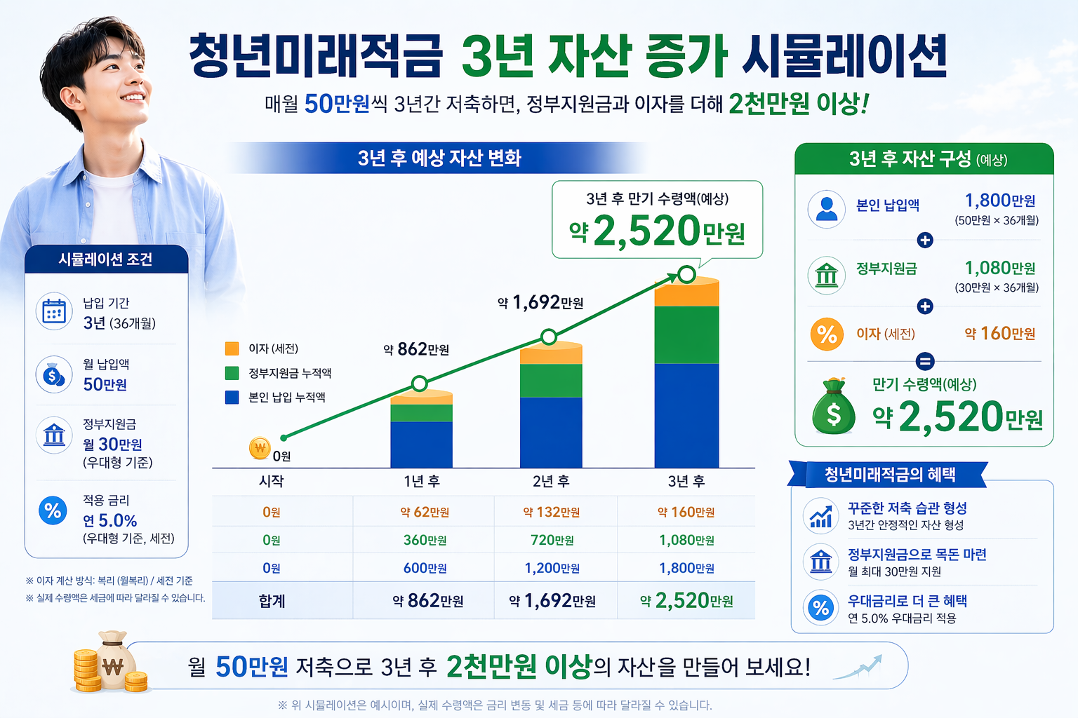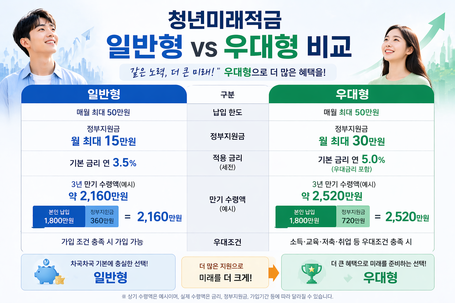 금융위원회 발표에 따르면 연 6% 금리를 가정하고 매월 50만원씩 3년간 납입했을 때, 일반형은 약 2,082만원, 우대형은 약 2,197만원을 수령할 수 있습니다(출처: 금융위원회). 원금 기준으로는 1,800만원이니, 우대형 기준으로 약 397만원의 추가 수익이 생기는 셈입니다. 제가 청년희망적금 만기 때 느꼈던 "생각보다 크게 안 불어났네"라는 감각과 비교하면, 우대형 기준은 체감 차이가 꽤 날 수 있겠다는 생각이 들었습니다.