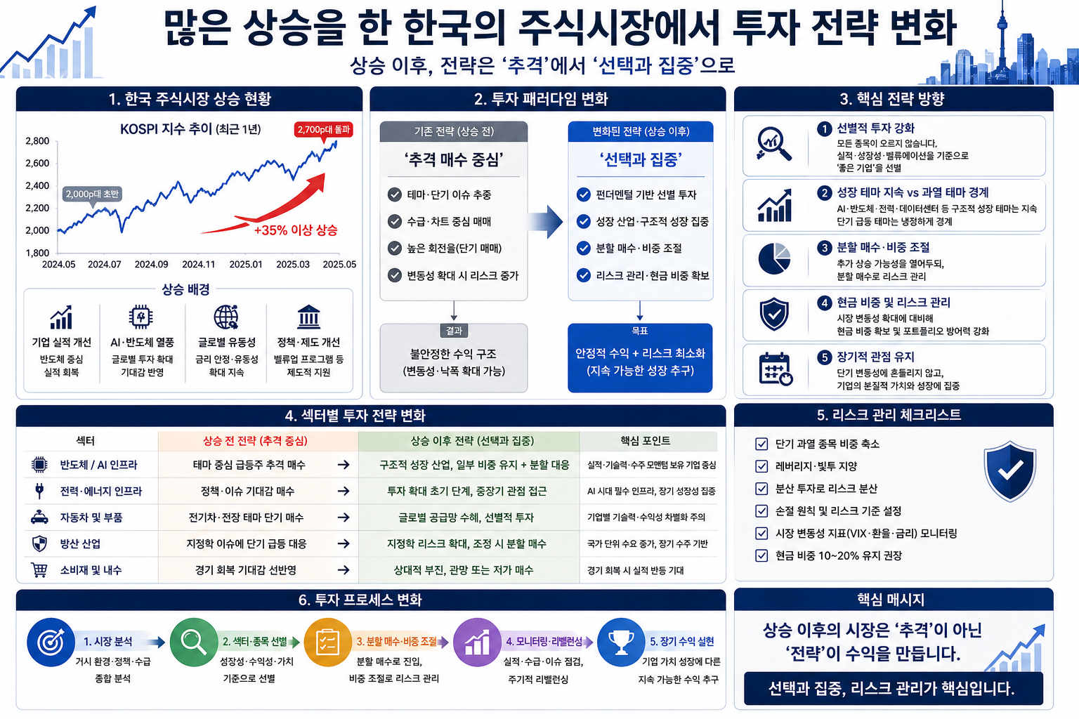 주식 좀 한다는 지인들을 만나면 요즘 대화가 전부 같은 데서 막힙니다. "지금 들어가도 되냐"는 질문이 나오고, 아무도 시원하게 답을 못 합니다. 저도 마찬가지였습니다. 그래서 오래 투자한 지인한테 직접 물어봤고, 그 대화에서 생각이 조금 정리됐습니다. 오른 건 맞는데 그게 끝이라는 뜻은 아닐 수도 있다는 것, 그리고 지금은 방식이 달라야 한다는 것.